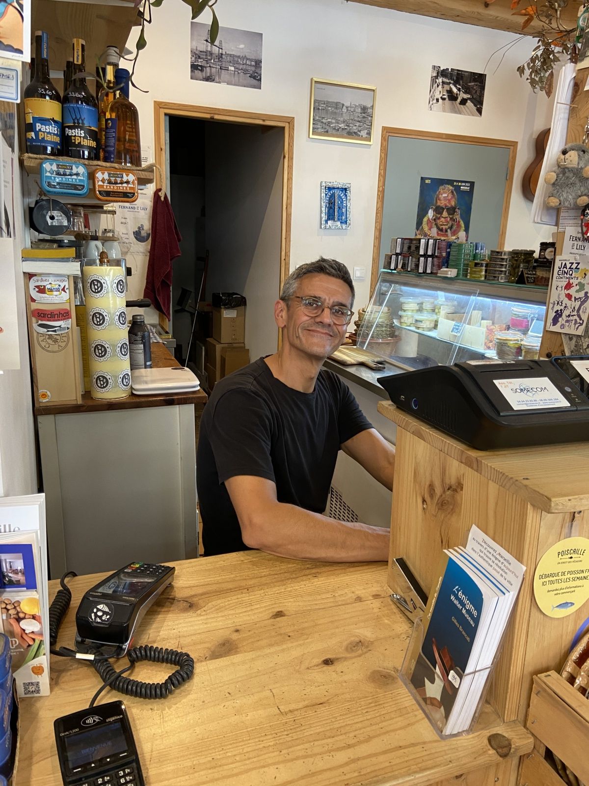 La boutique, une jolie façade bleue, une terrasse pour prendre l’apéro tout en grignotant quelques merveilles ou tout simplement déguster un bon café en papotant avec le maître des lieux, bon vivant et surtout un amoureux de Marseille.