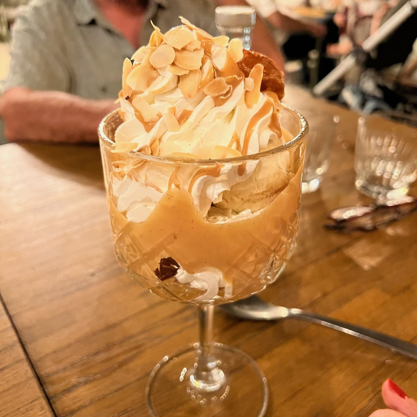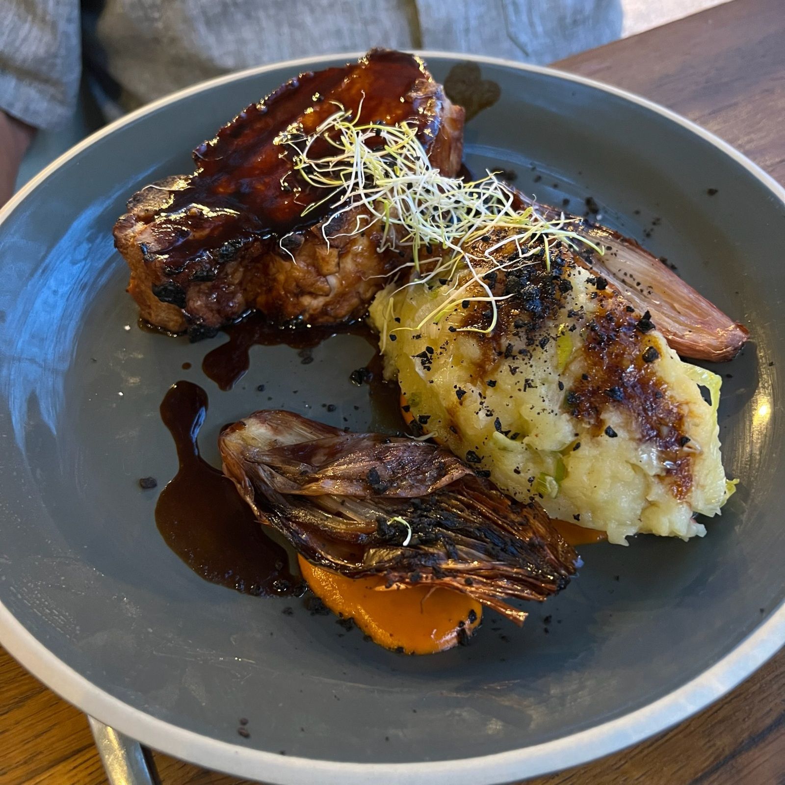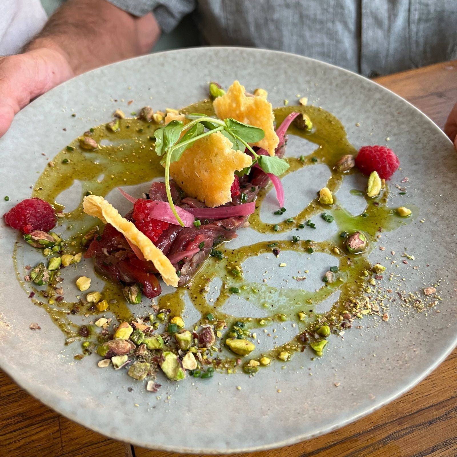 Pour notre dîner du 18 août 2025, nous avons comme entrée, les tomates Green Zebra à la glace au Broccio et graines de courgettes, une petite merveille de délice et fraîcheur. Malheureusement, les plats de ne sont pas à la hauteur comme l'entrecôte de cochon 289 grammes des Monts Légats ou le magret de canard à la braise. Les viandes étaient trop cuites. La cuisson manque de justesse.